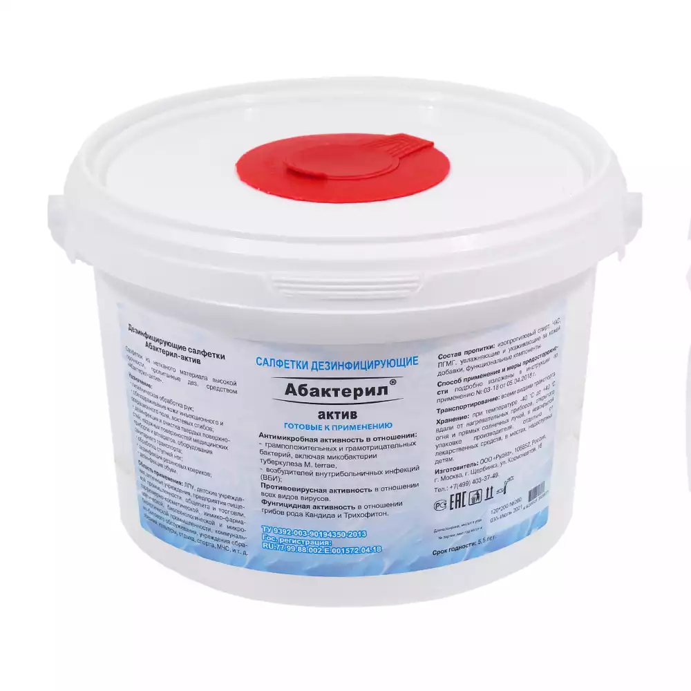 Салфетки "Абактерил - Актив", дезинфицирующие, размер 12*18см, в ведре 120шт, готовые к применению, Рудез (РОССИЯ)