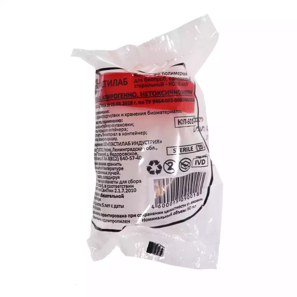 Контейнер 60мл, для взятия биоматериала, стерильный, индивидуальная упаковка, без лопаточки, ПЛАСТИЛАБ ИНДУСТРИЯ (РОССИЯ), 500 шт