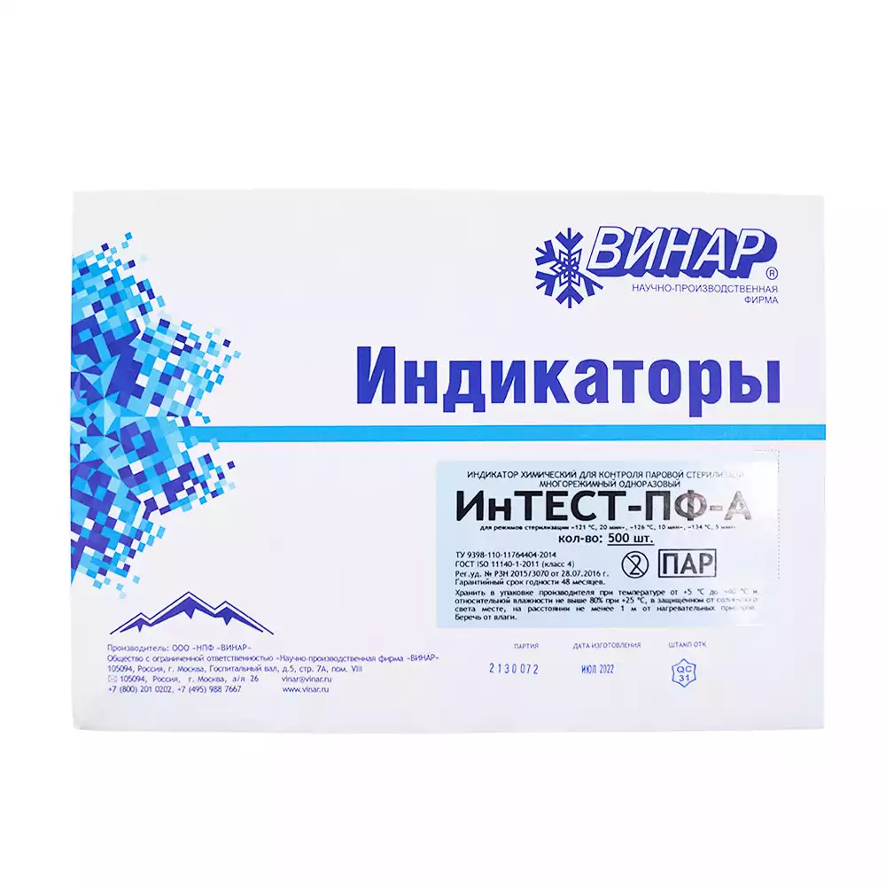 Индикатор стерилизации ИНТЕСТ-ПФ-А, универсальный для 3-х режимов, самоклеющийся, упаковка 500 тестов, без журнала, для контроля внутри и снаружиВинар НПФ (РОССИЯ)
