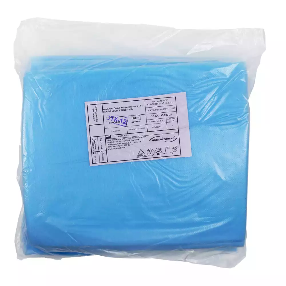Простыня 140*200см, материал Спанбонд 20г/м2, нестерильная, голубая, Волга Медикал НПП (РОССИЯ)