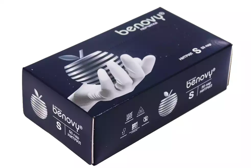 Перчатки BENOVY, размер S, нитриловые, вес 6,0г/пара, неопудренные, текстурированные на пальцах, цвет белый, нестерильные, 50 пар, TG Medical Sdn.Bhd.