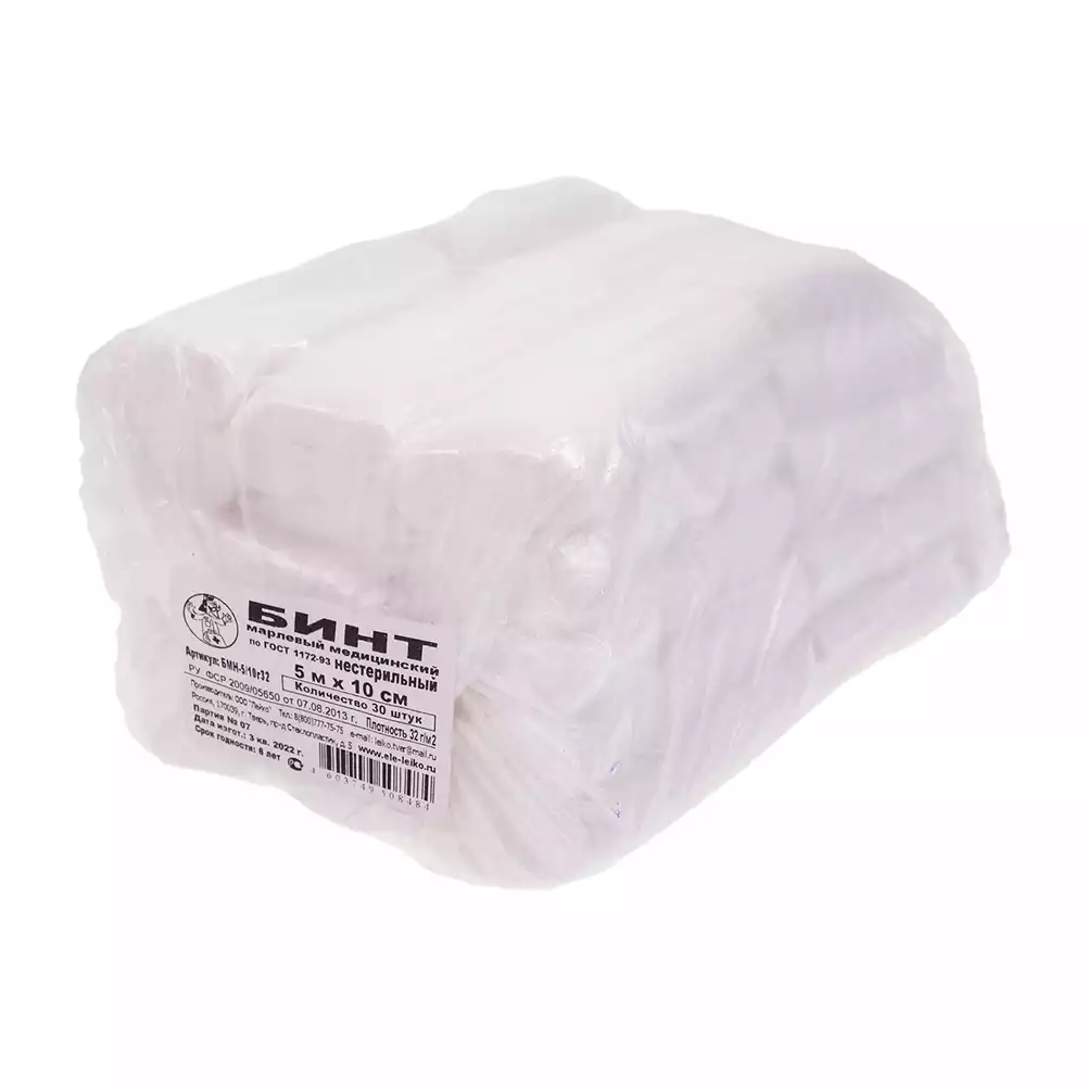 Бинт марлевый, размер 5*10см, плотность 32г/м2, нестерильный, Лейко (РОССИЯ), 30 шт