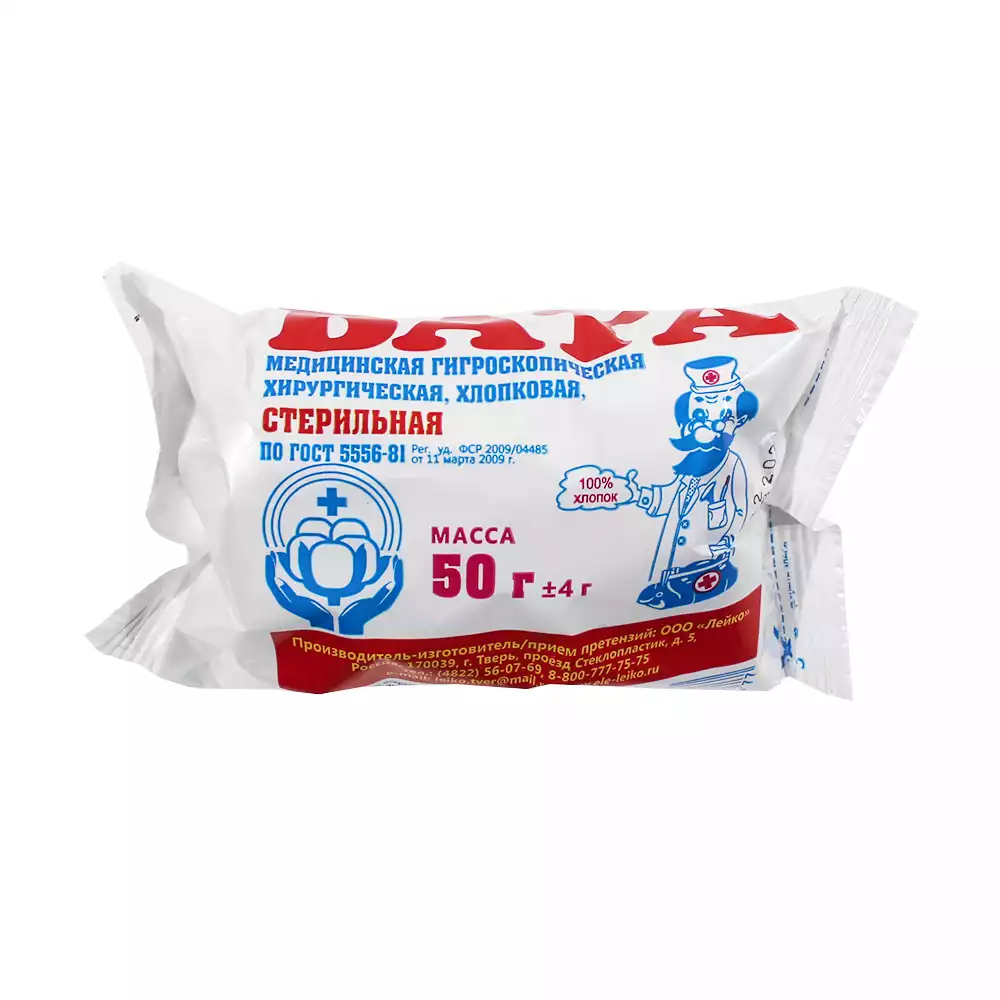 Вата 50,0г медицинская хирургическая стерильная, Лейко (РОССИЯ)