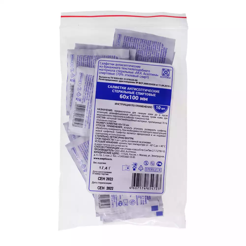 Салфетка спиртовая антисептическая для инъекций, размер 60*100мм, 70% этиловый спирт, упаковка 10шт, Z-пакет, Асептика М.К. (РОССИЯ)