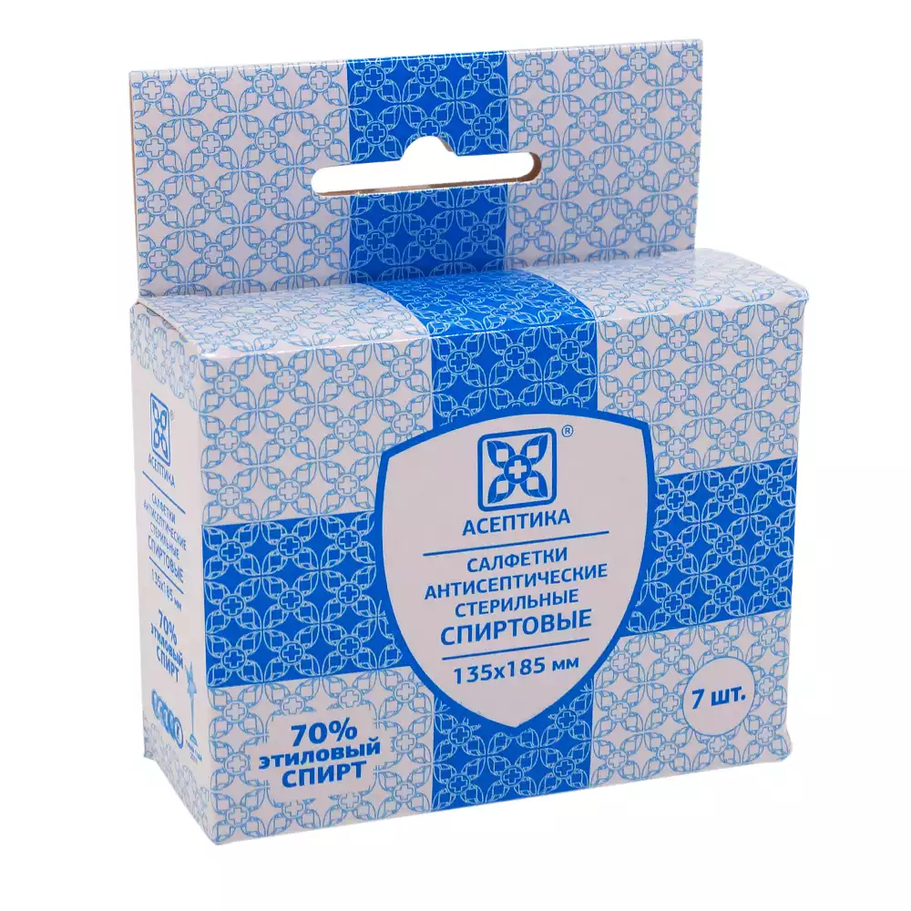 Салфетка спиртовая антисептическая для инъекций, размер 135*185мм, 70% этиловый спирт, упаковка 7шт, коробка, Асептика М.К. (РОССИЯ)