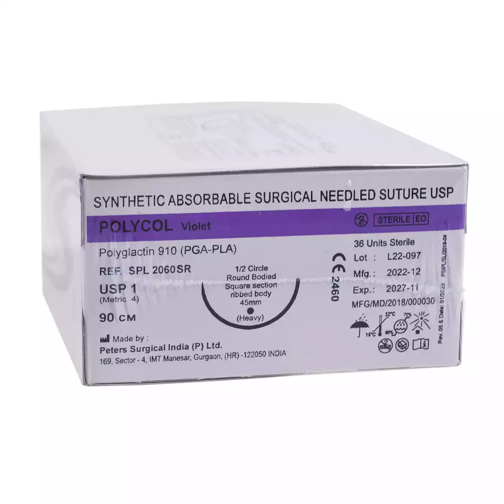 Поликол 1/0 (4,0), длина нити 90см, игла 1/2 круглая колющая тяжелая 45мм с продольными насечками, упаковка 36шт, SPL2060SRPeters Surgical (ИНДИЯ)